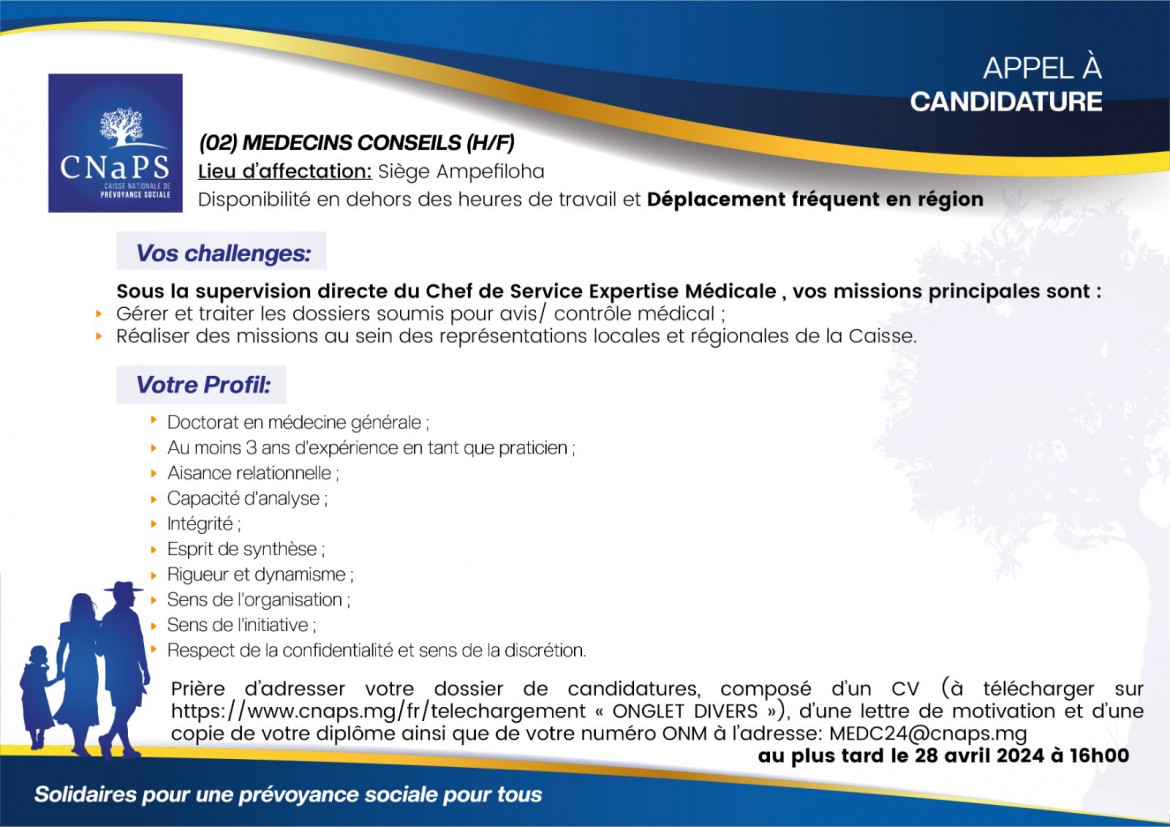 MEDC24@cnaps.mg pour le poste de MEDECIN CONSEIL.